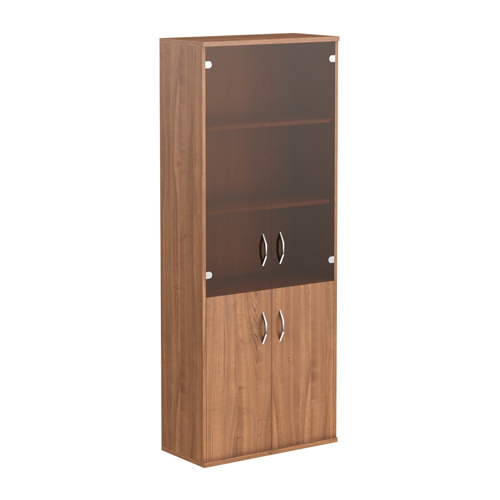 Широкий и высокий комбинированный шкаф IMAGO для офисного или домашнего использования. Размеры - 770х1975х365 мм, цвет - Орех Французский. Двустворчатый шкаф, оснащенный 5 просторными полками, две нижние полки закрыты дверцей из ЛДСП, три верхние - стекляной дверцей со стильной тонировкой в цвет бронзы. Шкаф оснащен регулируемыми опорами для компенсации неровностей пола.